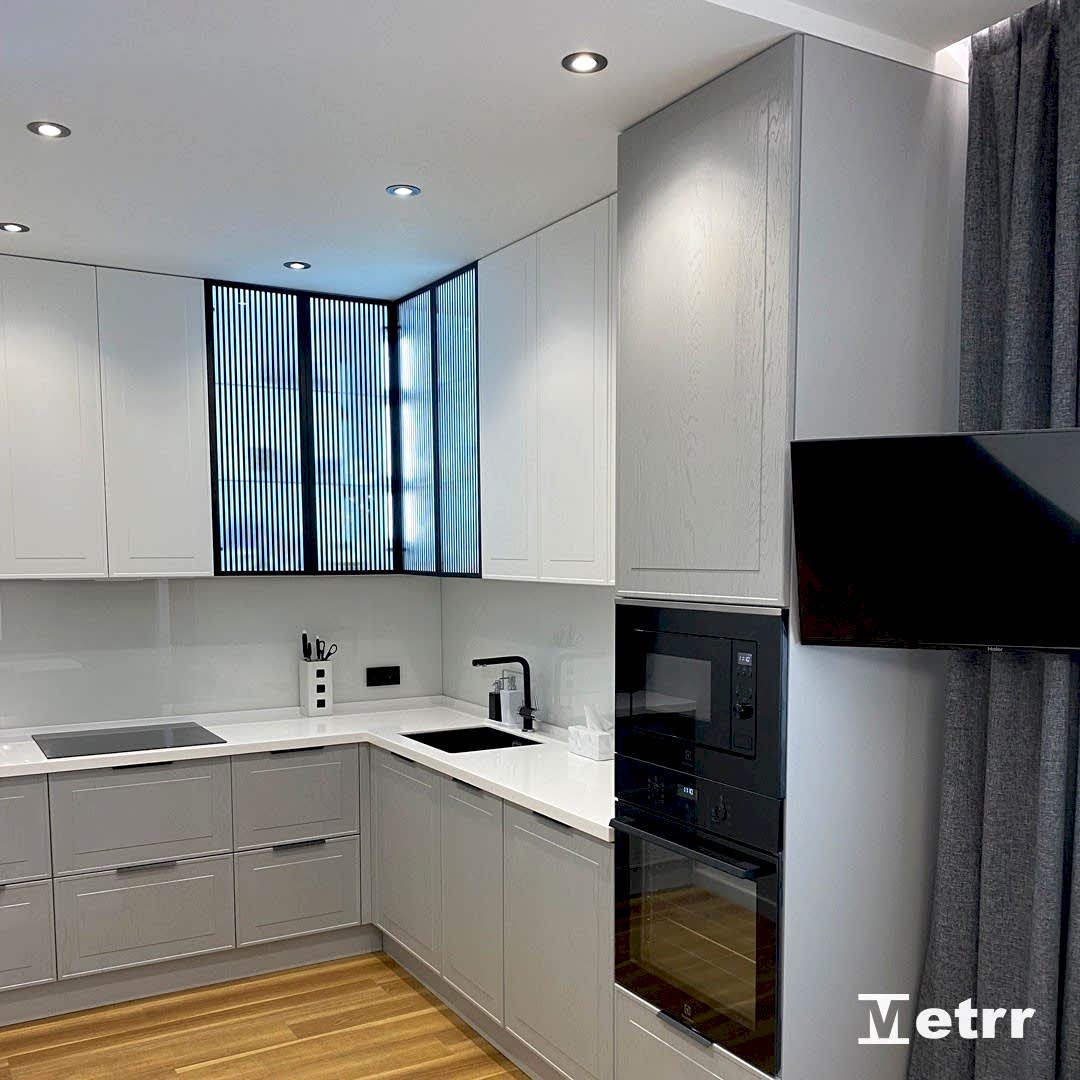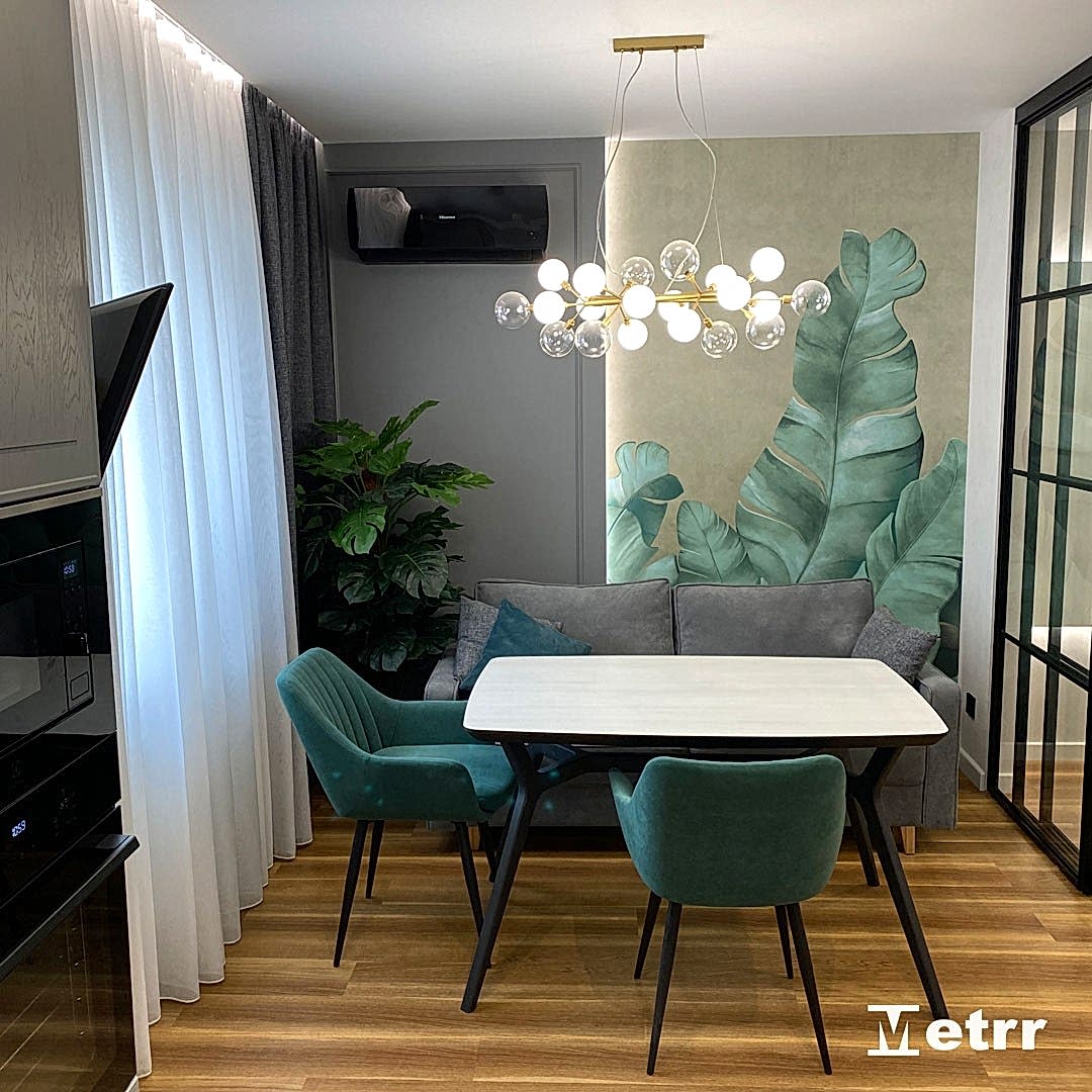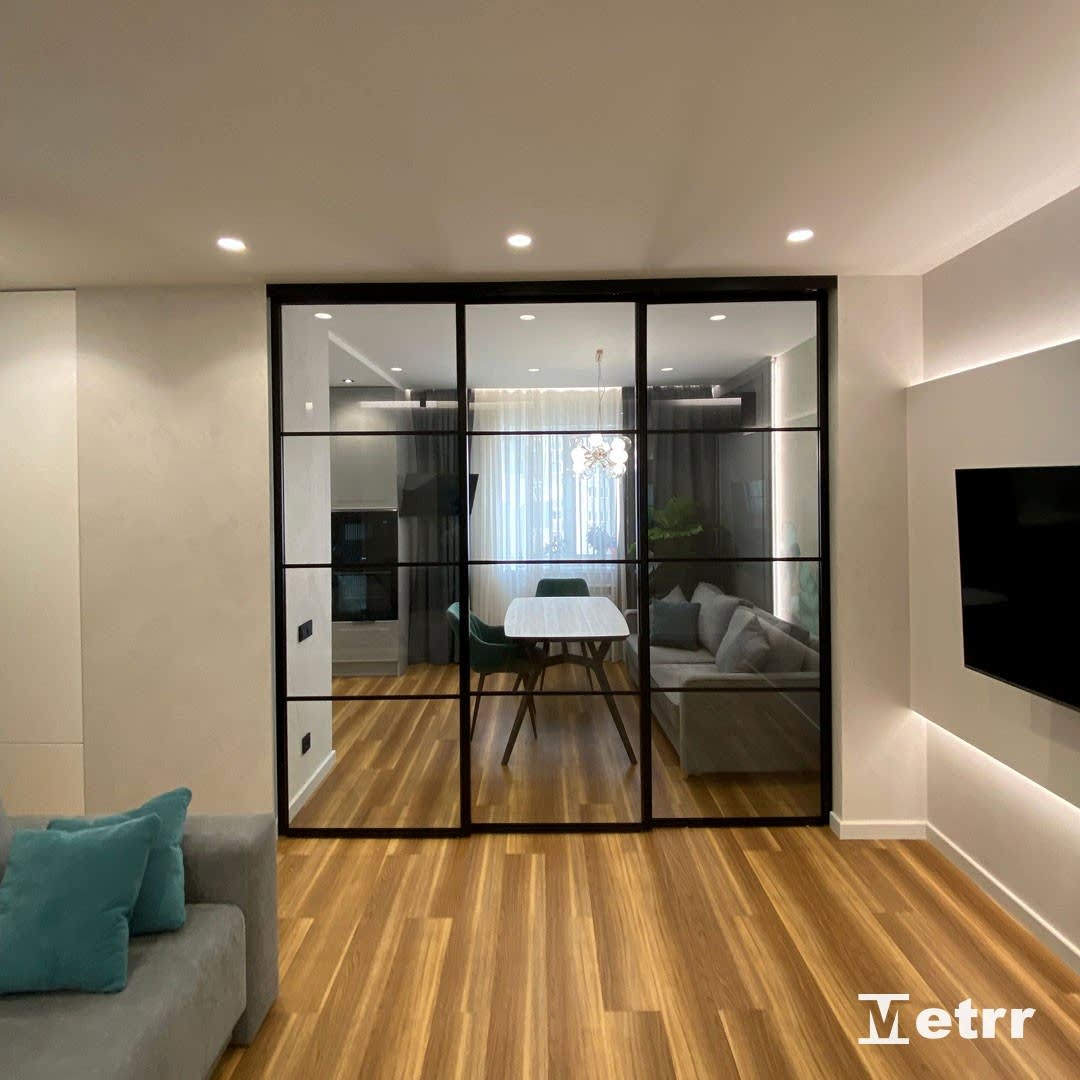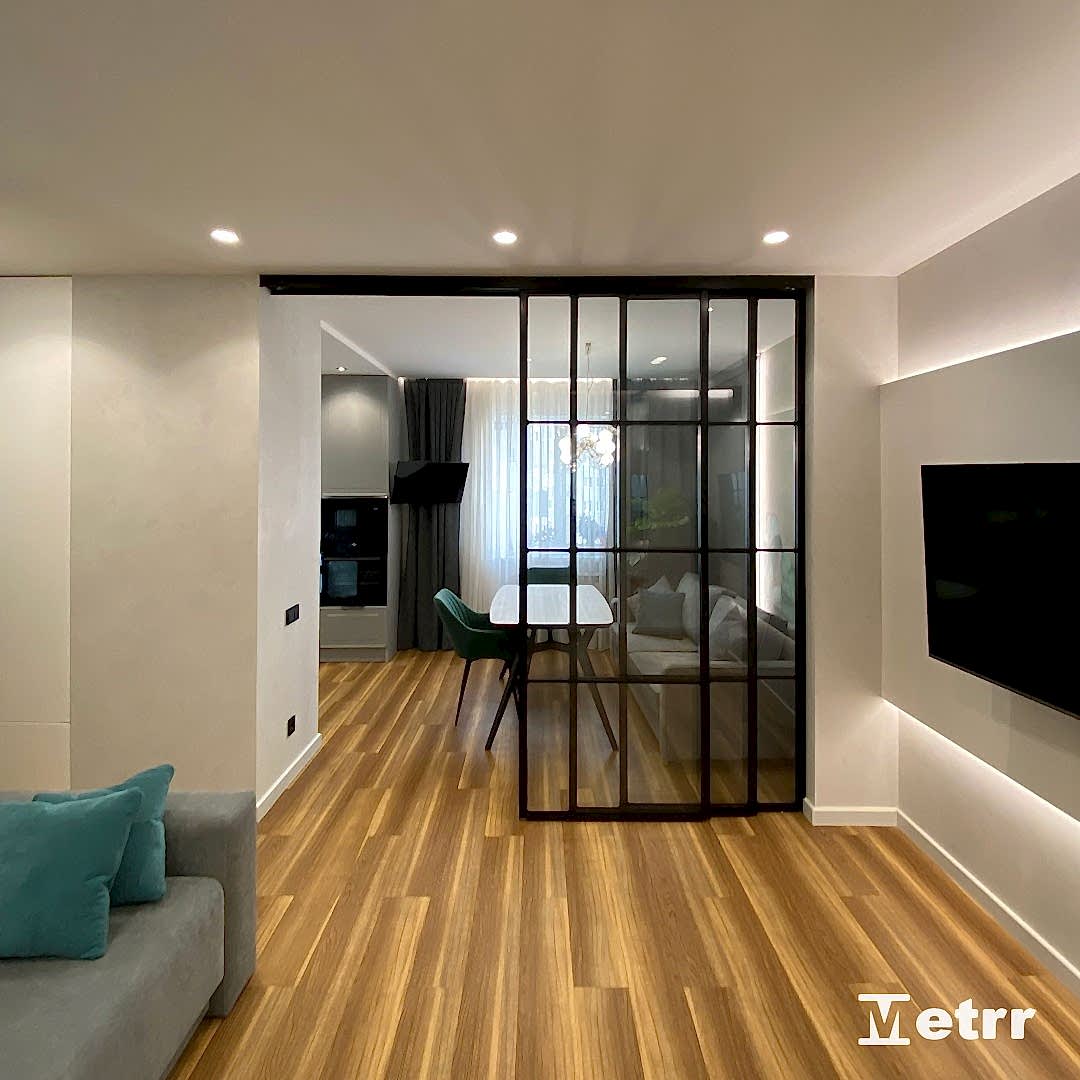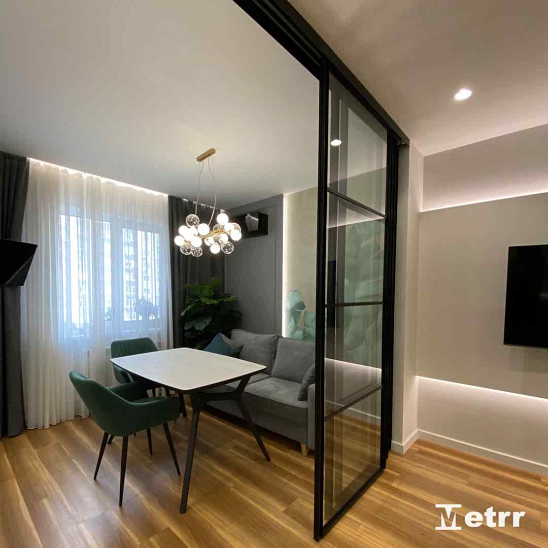 В кухне-гостиной установлены стеклянные двери-купе, Pin Up обеденную зону от зоны отдыха.