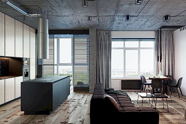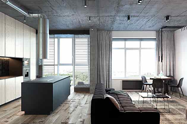 Подходит для Pin Up квартир и загородных домов. Стиль Лофт в интерьере предполагает наличие металлических конструкций, открытых коммуникаций, отсутствие дорогой отделки стен и полов. Зонирование выполняется с помощью светильников, мебели, стеклянных перегородок, ширм.